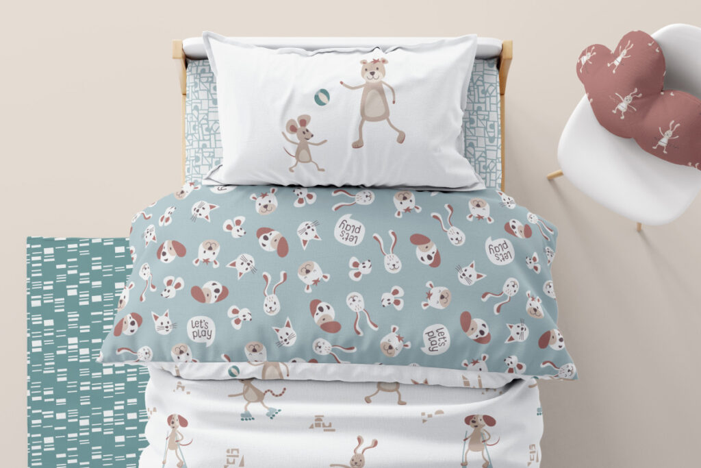 Ist das Produkt einfarbig oder mit einem Bildmotiv versehen? Das Bildmotiv kann ein einzelnes Bild sein, das nennt man „Placement Print“. Von Surface Pattern Design spricht man, wenn sich das Bildmotiv nahtlos wiederholt, wie zum Beispiel bei gemusterten Tapeten oder Stoffen.