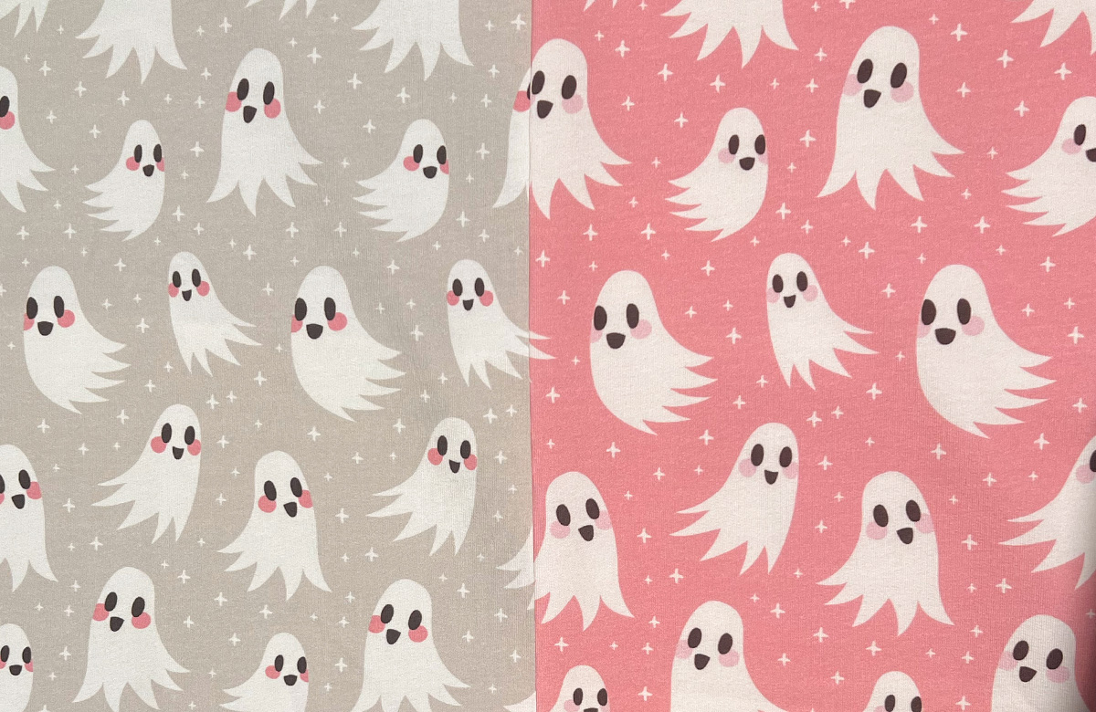 Die Stoffe mit dem niedlichen Geister-Design gibt es als Sommersweat in zwei Farbvarianten: rosa und sandgrau.